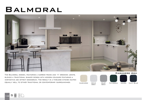 The Balmoral design, featuring a narrow frame and āVā grooved joints, blends a traditional shaker design with modern colours featuring a distinctive ash effect woodgrain. The result is a timeless kitchen suited equally well to either traditional or contemporary surroundings.