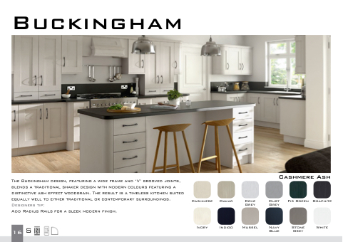 The Buckingham design, featuring a wide frame and āVā grooved joints, blends a traditional shaker design with modern colours featuring a distinctive ash effect woodgrain. The result is a timeless kitchen suited equally well to either traditional or contemporary surroundings. Designers tip: