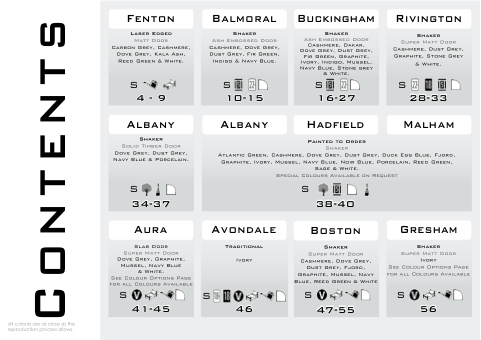 Atlantic Green, Cashmere, Dove Grey, Dust Grey, Duck Egg Blue, Fjord, Graphite, Ivory, Mussel, Navy Blue, Noir Blue, Porcelain, Reed Green, Sage & White.