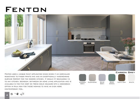 Fenton uses a unique paint application which gives it an unrivalled resistance to nger prints and has an exceptionally hardwearing surface perfect for the modern kitchen. It would t seamlessly in to any kitchen, bedroom, bathroom or home living application and is available in the ve most on trend solid colours with a woodgrain option in Kala Ash for those wishing to have an even more contemporary feel.