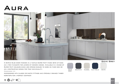 A Simple Slab door nished in a tactile Super Matt nish sets up Aura as a rm favourite for lovers of modern design. Available in a range of Super Matt colours which are strong enough to work on their own or as a contrasting design for true individuality.
