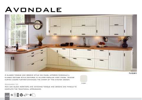 A classic tongue and groove style mid panel affords Avondale a classic cottage style featured in an ever popular ivory nish. Adding curved doors further enhances the charm of this kitchen design.