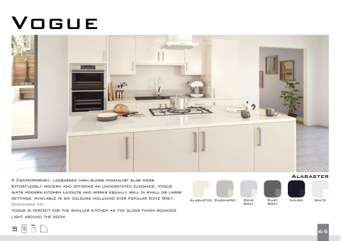 A Contemporary, lacquered high gloss minimalist slab door. Effortlessly modern and offering an understated elegance, Vogue suits modern kitchen layouts and works equally well in small or large settings. Available in six colours including ever popular Dove Grey. Designers tip:
