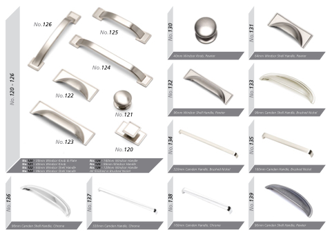 No.120 - 30mm Windsor Knob & Plate No.121 - 40mm Windsor Knob No.122 - 64mm Windsor Shell Handle No.123 - 96mm Windsor Shell Handle