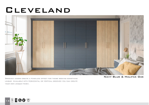 Cleveland Grooved doors create a panelled effect for those seeking something unique. Available with Horizontal or Vertical grooves you can create your own unique nish. Navy Blue & Halifax Oak 14
