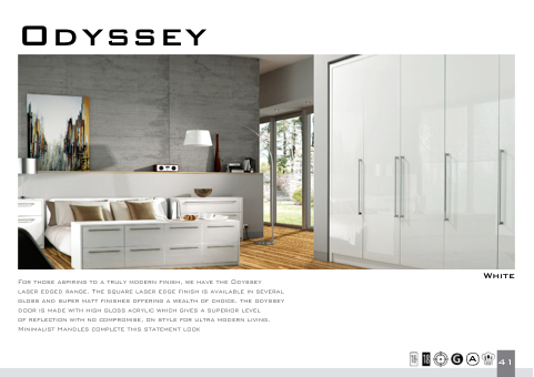For those aspiring to a truly modern nish, we have the Odyssey laser edged range. The square laser edge nish is available in several gloss and super matt nishes offering a wealth of choice. the odyssey door is made with high gloss acrylic which gives a superior level