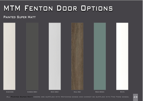 MTM Fenton Door Options Painted Super Matt Cashmere Carbon Grey Dove Grey Kala Ash Reed Green White All Painted Super Matt doors are supplied with Matching edges and cannot be supplied with Two Tone edges. 49