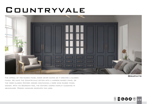 The appeal of the raised panel door never dates as it creates a classic nish. We have the Countryvale option with a narrow raised panel or the more classic Oxford design containing a more wide raised panel design. With its Georgian feel the Oxford doors display elegance in abundance. Period handles complete the look.